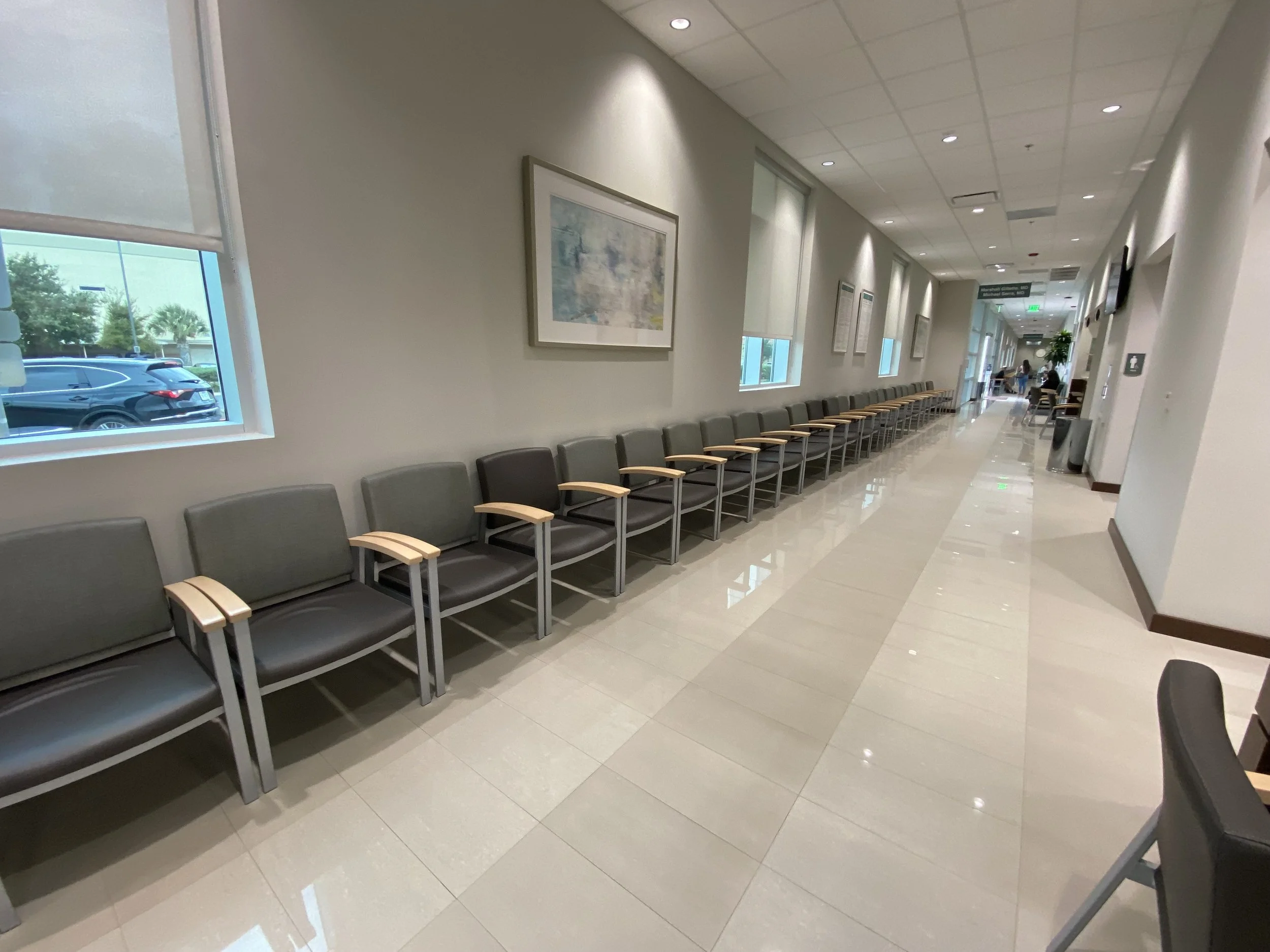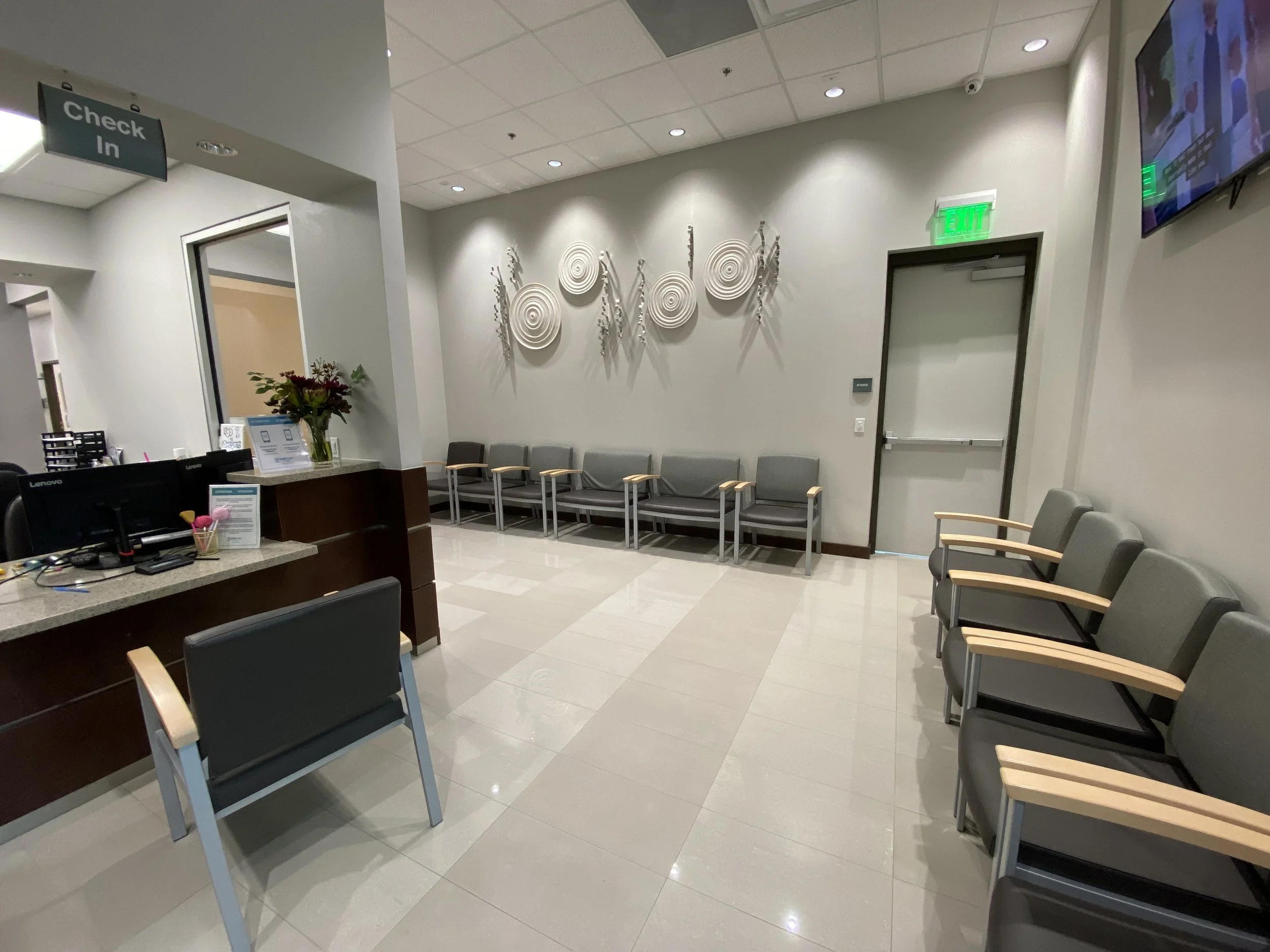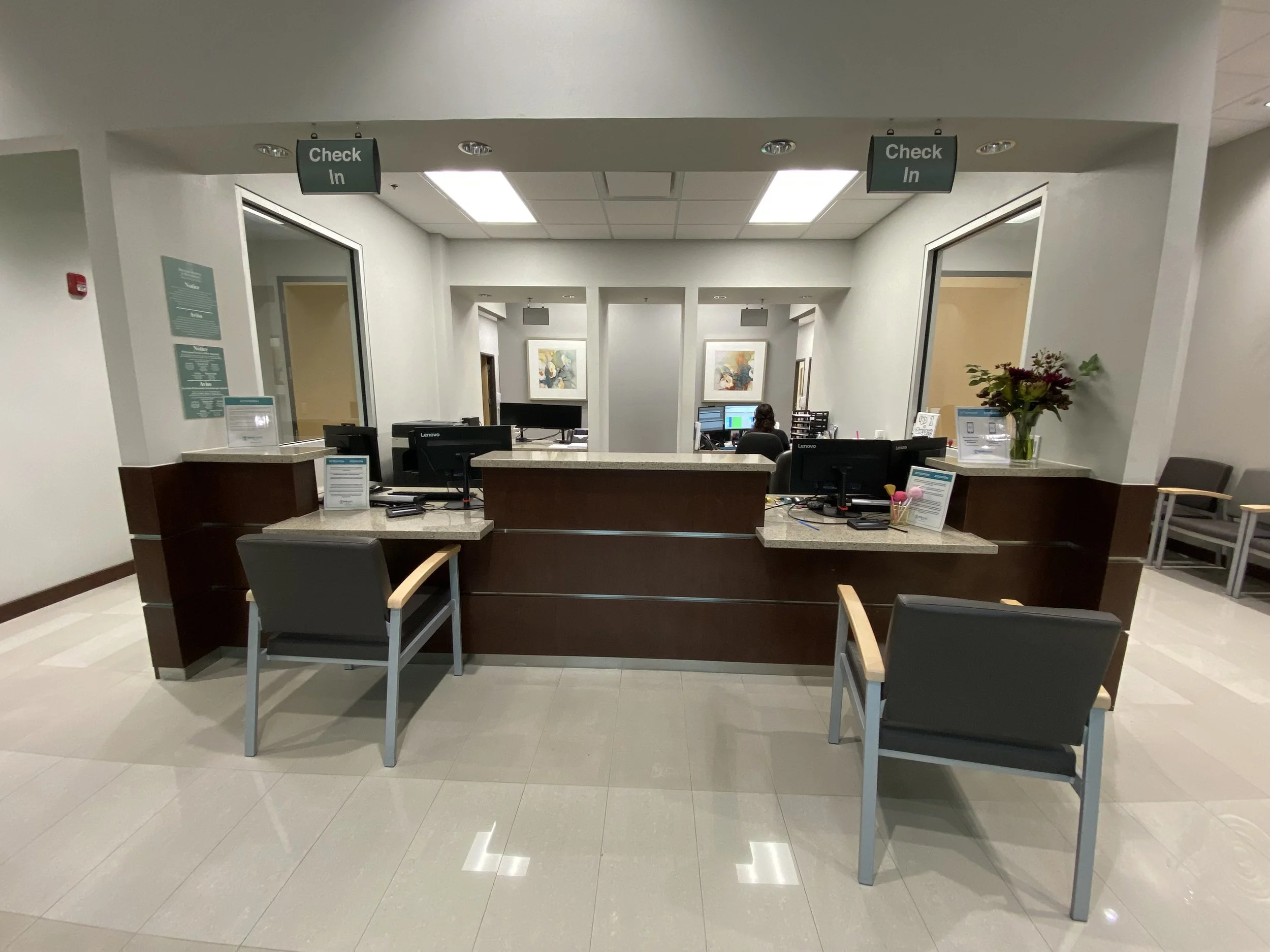 Once inside the front doors, go down the hallway to the right until you reach the last receptionist desk. The receptionists here will help you sign in for your visit.  The pictures below show our great clinic.